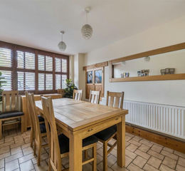 A welcoming entrance hall leads to a fitted kitchen/breakfast room with integrated appliances and a useful utility area. There is a large studio/additional bedroom with an en-suite shower room, a cosy sitting room featuring a wood-burning stove, and a dining room with French doors opening to the rear garden.