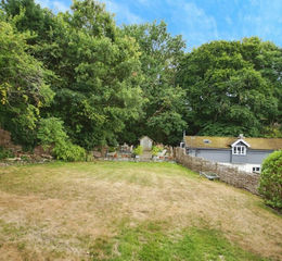 From there, doors cross a bridge to the patio and extensive garden, featuring established shrubs and lawn. A second patio surrounded by natural rock overlooks the entire garden offering a southerly aspect and guaranteeing a sunny spot throughout the