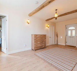 Upstairs, the generous landing enjoys open views across the paddocks. The principal suite combines rustic charm with modern luxury, featuring exposed beams, a walk-in wardrobe, fitted wardrobes and en suite shower room. Three further double bedrooms and a beautifully finished family bathroom with roll-top bath and walk-in shower complete the accommodation.