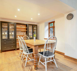 The entrance sets a welcoming tone that reflects the character and warmth found throughout the home. A solid timber front door with traditional iron fittings opens into a charming hallway, where the natural wood of the floors and staircase complements the cottage’s period style. Soft light filters through the glazed panels above the door, enhancing the sense of space and craftsmanship. From here, the layout flows naturally, with doors leading to the principal living spaces. The hall offers room for a console or chair a practical addition that enhances the home’s everyday functionality while the staircase rises gently to the first floor, creating a graceful focal point and a warm first impression.