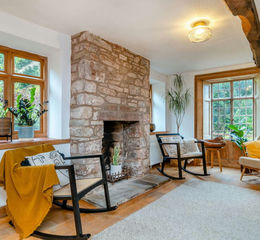 To one side lies the main sitting room, a wonderfully inviting space that captures the cottage’s rustic charm. An exposed stone fireplace with a log-burning stove set beneath a brick arch creates a striking centrepiece, perfect for cosy winter evenings. Exposed ceiling beams and neutral tones add warmth and texture, while the wide window with original wooden shutters frames peaceful garden views and fills the room with natural light. Spacious enough for generous seating, this room is both intimate and versatile a true heart of the home.