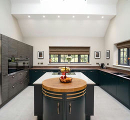 The high-end kitchen is a true showpiece, featuring an array of integrated appliances including two double ovens, a microwave oven, a warming drawer, and an induction hob with a built-in extractor, perfect for the aspiring chef. Additional features include a built-in fridge and freezer, wine cooler, Quooker tap, two dishwashers and a waste disposal unit. Finished to the highest specification, the kitchen showcases striking contrasting units and worksurfaces, while two large lantern lights and a vaulted ceiling flood the space with natural light, creating an exceptional setting for both cooking and entertaining.