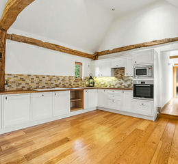 The accommodation is light and well proportioned throughout, with vaulted ceilings, exposed timbers and solid oak flooring with underfloor heating. The heart of the home is the impressive open-plan lounge/dining room with French doors opening onto the gardens, complemented by a well-appointed kitchen/breakfast room with integrated appliances and a separate utility room.