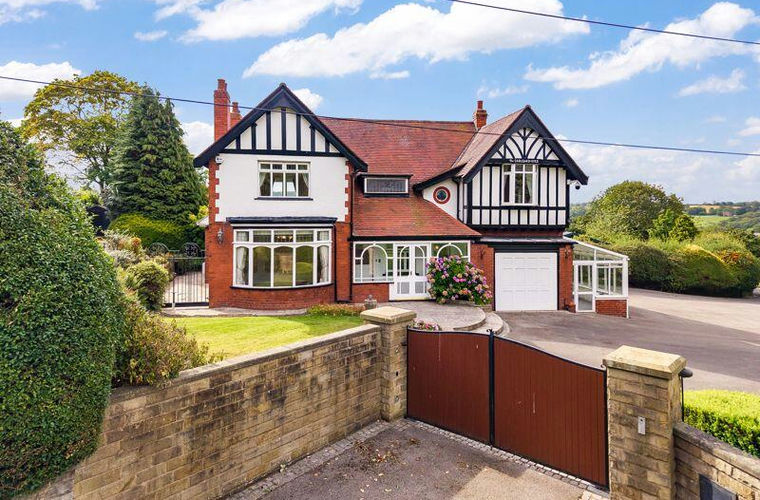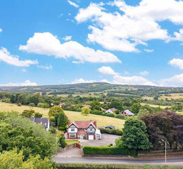 The property opens with glazed double doors into a porch leading into a grand hallway with hand-painted timber panelling and an intricately carved spindle staircase. Original Arts & Crafts features continue throughout, including deep skirting boards, plaster mouldings, decorative coving, and timber doors. The formal dining room, with a bow window and decorative plaster ceiling, offers an elegant setting for entertaining. The main lounge is generously sized, featuring a large bay window, arched detailing and an impressive exposed brick ingle fireplace with hearth and mahogany accents. The dining kitchen is fitted with a range of wood-effect cabinetry, granite worktops, integrated appliances and French doors opening into a striking timber-framed orangery. The orangery enjoys panelling and a central cupola—perfectly positioned to take in the outstanding valley views. A rear hall leads to a tiled cloakroom, the second utility room (with Belfast sink and space for laundry appliances) and a study featuring timber flooring, a multi-fuel stove, and built-in display shelving. There is also access to a side and practical conservatory, complete with grape vine, with doors to the driveway. Upstairs, the L-shaped galleried landing features a beautiful stained and leaded glass window and dado-height panelling. The large and triple-aspect master suite includes a fitted dressing area, French doors to a private balcony, and an en suite bathroom with Travertine tiling and a four-piece suite. Three further bedrooms—two spacious doubles and one currently configured as a home office—are served by a family bathroom featuring a jacuzzi bath. There is an additional wet room shower.