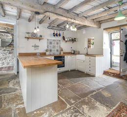 The cross-passage entrance hall links the front of the home directly to a secluded rear courtyard that is perfect for outdoor entertaining. The open layout within the home perfectly balances the historic significance of the home with the needs of contemporary living. On one side of the building is a charming farmhouse kitchen and dining area, fitted with cream shaker units, oak and ash worktops, a Belfast sink, integrated electric oven, NEFF induction hob, and a traditional pantry. A matching dresser and an electric AGA, set into a traditional stone inglenook, complete this inviting space.