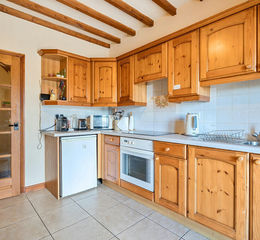 The extra wide, glazed door opens into the Dining Kitchen. With ceramic tiled floor and space for dining table. Furnished with 'pine' wall and base cabinets with 1½ bowl stainless steel sink unit and built in electric oven and hob. Space for under counter fridge. A full height internal window and glazed door leads through to the Inner Hall with stairs to the First Floor and useful under stairs cupboard. Open to the 'Utility Room'. There is high level shelving and space for washing machine and tumble drier, plus extra storage. Linen cupboard and door to Ground Floor Cloakroom with a coloured 2 piece suite comprising WC and pedestal wash hand basin.