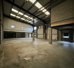 A modern warehouse/industrial facility with parking and loading area to the front. The unit benefits from 3 full height electric loading doors and 6.1m eaves, rising to 7.7m at the apex.