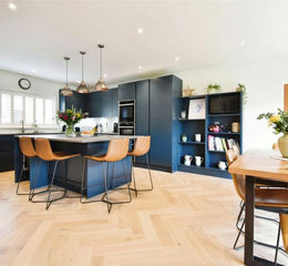 Kitchen/Dining/Living Room: L-shaped space with impressive fitted kitchen featuring stainless steel sink, quartz countertops, large island with storage, breakfast bar, induction hob, triple NEFF electric ovens, integrated appliances, oak floor with underfloor heating, LED lighting and bi-fold doors to garden.