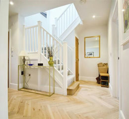 Entrance Hall: Solid oak floor, understairs storage, LED lighting.