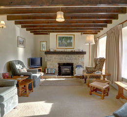 Lounge with stone fireplace, in which stands a gas stove, and 2 windows to the front; beamed ceiling.