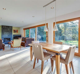 The elegant sitting room, also with an open fire, is bathed in natural light from a large window, framing views over the garden, and features bi-folding doors that open directly onto the terrace.