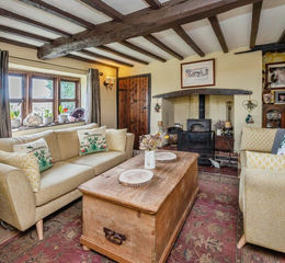 Front aspect double glazed window, radiator, natural wood flooring, beams to ceiling and walls, wood burner inset to feature fireplace with raised hearth, curved beam above and deep corner alcove. Opens through to Hallway & Study Space.