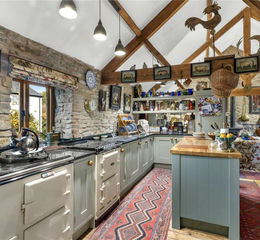 Kitchen with bespoke wooden book shelves, base units with granite work top and Russel Alexander Island with wooden work surface. Cream electric double Aga and a second single Aga with 2 ovens and ceramic hob. Dishwasher, stainless steel basin and inset larder fridge .