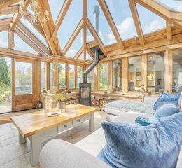 The generous sitting room is centred around a magnificent Inglenook fireplace with log-burning stove, extending into a garden room with views over the pool and Spanish garden. From here, access leads to a superb oak and glass room, complete with feature log burner and French doors opening onto the rear terrace.