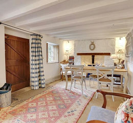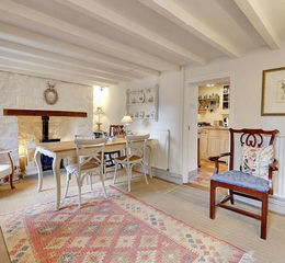 Bespoke windows shutters, exposed beams, stone fireplace with wood burning stove, flagstone floor, door to kitchen, enclosed stairwell to first floor.