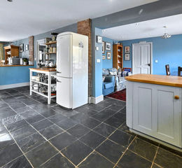 Interior - As you step into the grand hallway with its vaulted ceiling and central staircase, you'll be struck by the welcoming and spacious feel of this home. The open-plan 'L-shaped' kitchen with breakfast and family areas forms the social heart of the home. The kitchen area is fitted with elegant, country-style cabinetry and solid wooden worktops. An 'Everhot' electric range cooker with induction hob is available by separate negotiation. Additional appliances include an extractor fan, dishwasher, two fridges, and a freezer. The utility room offers more cabinetry and plumbing for a washing machine, with space for a dryer, and there is a bathroom conveniently located for use after outdoor work or gardening. The impressive drawing room features a brick inglenook fireplace with a log-burning stove, perfect for cosy winter evenings, and provides a lovely space to relax. The property also boasts a large dining room, a study ideal for home working, a guest cloakroom, and a versatile sitting room that could serve as a guest bedroom or a perfect retreat for a teenager.