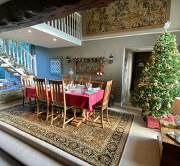LIVING ROOM & DINING AREA: 29'5" x 19'7" a lovely open plan room including an Inglenook fireplace with multi-fuel stove, beamed ceiling, exposed low level stone seat/display, 5 wall light points and step up to a generous dining area with a feature barn door window, staircase to a gallery landing and further lobby 10'2" x 5'0" leading to: