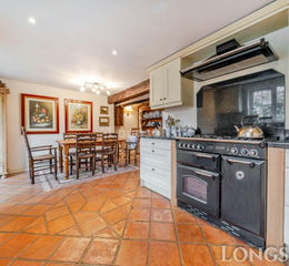 Range of fitted units to walls and floor, granite work surface over with granite up stands, sink with mixer tap and drainer, Rangemaster gas cooker with gas hob, granite splashback and extractor fan over, integrated fridge/freezer, space and plumbing for dishwasher and washing machine, exposed beams to walls and ceilings, UPVC double glazed window to rear, UPVC double glazed French doors to rear, radiator.