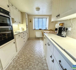 A range of fitted floor and wall units with a built in double electric oven, inset ceramic hob with an extractor hood over, built in larder fridge/freezer and dishwasher, inset one and a haf bowl sink, radiator, vinyl flooring.