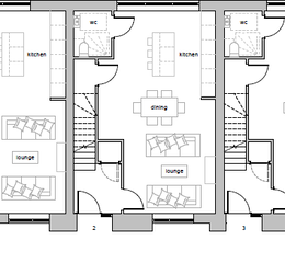 A row of 2 x 2 bedroom houses and 1 x 3 bedroom house to include: