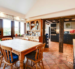 Spanning three storeys, the home features two staircases leading to the bedroom accommodation. The ground floor has a semi-open plan layout, with three reception areas defined by open stud walls, each richly timbered and featuring characterful fireplaces. The country-style kitchen opens into a charming garden/breakfast room, which leads to the service rooms and a covered walkway to a superb, detached leisure building. Now with a roaring log burner, the space was previously used as a leisure space, making it ideal for entertaining, relaxation, or guest use.