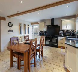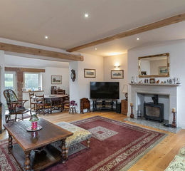 Underfloor heating runs throughout the house, with engineered oak and tiled floors complementing the natural textures of the exposed beams and stonework. The ground floor has been thoughtfully arranged to create an easy flow between the main living spaces. Anchored by a stone fireplace, the spacious living room transitions into a well-proportioned dining area, which enjoys garden views through large windows.