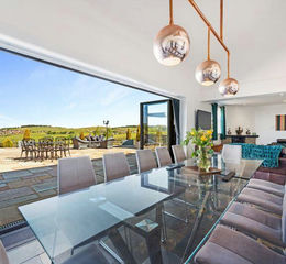 Fitted with bespoke white gloss wall and base units, granite work surfaces and a 5 ring gas hob on the breakfast bar. Double electric oven, microwave, stainless steel sink unit, dishwasher, space for fridge freezer, tiling on floor throughout this room. Bi fold doors that frame the views well and open onto the patio.