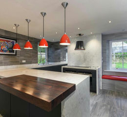 The kitchen is exceptionally well-appointed, featuring an ultra-modern design with sleek black bespoke cabinetry contrasting elegantly with pristine white marble countertops and breakfast bar, creating a striking and sophisticated aesthetic. Integrated high-end appliances include a Quooker boiling water tap, a Siemens double oven and induction hob beneath a ceiling-mounted range hood. The open layout and minimalist finishes create a refined space perfect for entertaining.