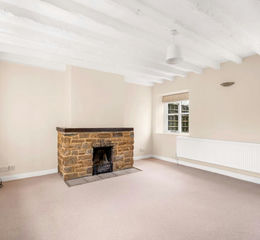Living Room with open fireplace with stone surround, timber mantelshelf and stone hearth, exposed painted beams, walk-in understairs store cupboard.