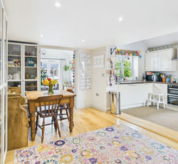 A lovely open plan room, with windows to the front and rear. Stairs rising to the first floor, and opening to Sitting room. Kitchen area: Well fitted range of Vanilla gloss fronted units set under a contrasting work surface. Inset white ceramic single drainer sink unit with mixer tap. Range of base units, space and plumbing for dish washer and washing machine. Double oven, with four burner induction hob above, Matching range of wall mounted units. Full volume ceiling.