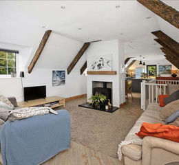 Stairs rise to the impressive open plan living area with partially vaulted ceiling, exposed beams enjoying plenty of natural light and taking in some views over its own paddock and to the rolling countryside beyond. Recently fitted kitchen. Kitchen with quartz worktops and island with built-in sink and mixer tap. Bosch double oven and induction hob. Integrated AEG dishwasher. Space for free standing fridge/freezer. Plenty of additional space for a dresser.