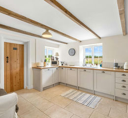 Double glazed windows to side and rear, drainer sink, worktops, base level storage units, space for Rangemaster cooker with extractor hood over, integrated fridge, dishwasher and washing machine, exposed ceiling beams, tiled flooring, radiator.