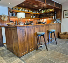 Entrance vestibule with main BAR to the left which is split into two sections and offers seating for 60 with wood constructed BAR SERVERY, tile and wood flooring, exposed stone walls and log burner.