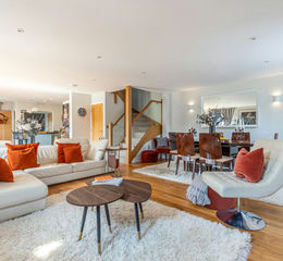 The entrance hall with guest cloakroom leads into a generous open-plan living space designed with modern lifestyles in mind. Solid oak flooring runs throughout, creating synergy within the space and excellent flow between cooking, dining and relaxing.
