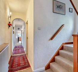 UPVC double glazed 'French' doors opens into the reception hallway featuring an archway and a tiled step leading to another hallway area. The hallway includes a textured ceiling, ceiling light point, wall mounted heating controls, wall light points, a double panel radiator, and stairs ascending to the first floor rooms. Additionally, there is a storage cloakroom cupboard housing the hot water tank and is equipped with shelving and an automatic courtesy light.