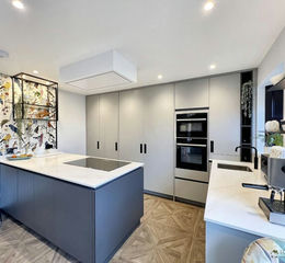 Bespoke, high-quality cabinetry offers generous storage with a mix of full-height and base units, coherently blending style and functionality. Striking contrasting worktops with upstands, add a touch of sophistication, while a hidden pantry, concealed behind elegant doors, provides discreet yet accessible storage for a clutter-free space. At the heart of the kitchen, a stylish central island houses an induction hob, paired with a sleek ceiling-mounted sunken extractor hood for a seamless look.