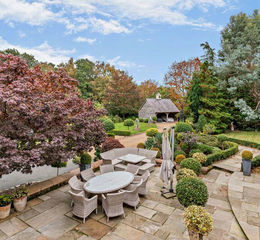 The stunning landscaped gardens, which have been subtly lit and designed by a landscape architect, include modern art contemporary statues. A large Indian stone alfresco sitting/entertaining area can be directly accessed from the kitchen/family room with well stocked borders beyond, which include an Acer tree water feature. A pathway edged in box gives access onto the lawns beyond.