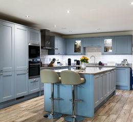 A bespoke modern blue coloured 'Shaker' style kitchen fitted with a range of wall and base level units incorporating drawers and cupboards with a granite worksurface with matching upstand. Inset bowl and a half sink unit with chrome mixer tap and granite routed drainer. A number of integrated appliances include AEG five ring induction hob with AEG chrome chimney style extractor above, AEF oven and grill with matching AEG microwave oven, built in fridge and freezer and dishwasher. A large double opening larder cupboard. A larger than average island unit with granite worksurface with built-in pull-out drawers and cupboards and two wine racks.