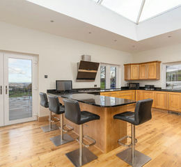 The breakfast kitchen is well-proportioned, light filled room with windows to three sides plus a large roof lantern. It houses solid wood units with black granite work surfaces, a four-burner gas hob with feature extractor above, electric double oven, integrated dishwasher and wine fridge, and space for an American style fridge freezer.