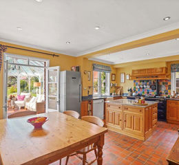 From the main hallway a magnificent central staircase stands proud leading to a galleried landing with a large circular lantern which allows natural light to flood in. The ground floor accommodation comprises of a formal drawing room with dual aspect windows, built-in cupboards and open fireplace, a study with built -in cupboards and French Windows and doors leading out on to the garden and a large dining room also benefitting from a log burning stove. These 3 bright rooms have views stretching out over the gardens and paddocks towards the woodland beyond.