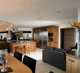 The 12 seater dining table sits on a rug which conceals a large hatch access to the games room below, and is supported by kitchen and bar facilities behind a wall of folding leather doors which open to reveal a Miele oven, microwave, coffee machine, sink, dishwasher drawers, dinner service, glasses and cutlery, storage, a cocktail bar and a second Sub Zero fridge freezer. The padded window seat on one side overlooks the formal rose garden and doors to the terraces from the dining area and the garden room enables the area to work perfectly as an inside/outside entertaining space, with easy access to the BBQ/alfresco dining area, gardens, outside bathroom and office/storage.