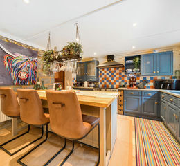 The accommodation comprises Entrance Hall / Boot Room, Fitted Kitchen / Family Room with central island and French doors to garden, Dining Room with inglenook fireplace and exposed beams, Laundry Room and Cloakroom, Living Room with full-width sliding glass doors to garden, four-sided woodburner and kitchenette, Shower Room, Master Bedroom with Ensuite Shower Room, 3 further Bedrooms and Family Bathroom.