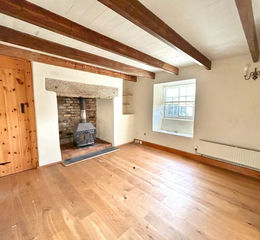 A characterful room with inglenook fireplace, with granite lintel over and woodburner (not tested) set on a tiled hearth. There is a built-in storage cupboard, beamed ceilings, wood effect flooring and a sliding sash window to the front aspect.