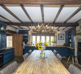 The superb farmhouse-style dining kitchen has mullion windows to front and rear aspects and features a lovingly restored range. The kitchen houses bespoke hand-painted units with timber worktops incorporating an undermounted Butler sink; equipment includes a Rangemaster stove with LPG gas hob and integrated dishwasher, there is space for a large fridge freezer and useful understairs storage. Adjacent to the kitchen is a spacious utility room with generous storage, sink and plumbing for a washing machine and space for a dryer.
