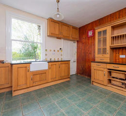 Quarry tiled flooring, single glazed window and door to side. Plumbing for washing machine/dishwasher.