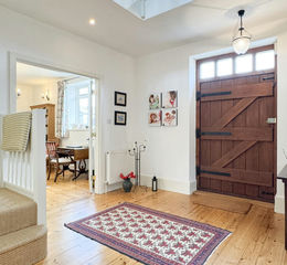 Upstairs, a vaulted landing leads to four generous double bedrooms. The principal suite features dual-aspect windows, countryside views, and an en suite shower room. Two rear bedrooms overlook the garden, while the fourth enjoys a stunning front-facing view. A stylish family bathroom completes the floor, with a roll-top bath and traditional fittings. The Hayloft is serviced by mains gas, private drainage (Klargester), and high-speed broadband. No onward chain.