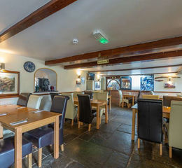 Continued in the same style and arranged into 3 interconnecting rooms, with low beamed ceilings, slate flooring and alcove seating. The rooms are furnished with a selection of solid timber tables and upholstered high backed dining chairs with some settle seating.