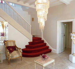 A magnificent and welcoming entrance area from where the elegant staircase with a wrought iron balustrade and wide lower steps leads to the first floor. The floor is tiled and there is an arched white brick firesurround and a beamed ceiling.