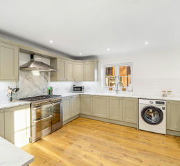 Breakfast Kitchen 6.39 m x 3.90 m (20'11 x 12'9) - There are uPVC windows to both the side and rear aspects as well as a uPVC stable style door to the side aspect. The flooring is of wood grain effect laminate and there are LED spotlights to the ceiling, a vertical radiator and space for an American style fridge freezer. The kitchen comprises a range of marble effect worktops with shaker style drawer and cupboard units at both base and eye level. The work surface extends into a breakfast bar with an overhang suitable for breakfast bar-stools. There is an integrated dishwasher and a dual fuel Stoves stainless steel cooking range with a gas hob, electric ovens and stainless steel extractor canopy above. There is space and plumbing beneath the work surfaces for a washing machine and tumble dryer and a ceramic sink has mixer taps over with 'metro' style wall tiling where appropriate.