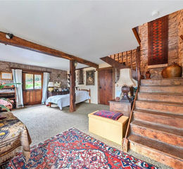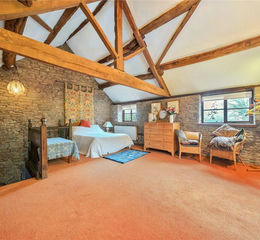 To the left of the living room is the dining room, which also features exposed timbers and an understairs cupboard. Double doors open into an additional reception room, a versatile space that leads to a utility room, second family bathroom, and a kitchenette, making it ideal for multi-generational living. This reception room also has a second staircase leading to a fantastic bedroom with exposed walls, exposed timbers, and dual-aspect windows, creating a bright and characterful space. The main staircase leads to the first floor, which provides access to two double bedrooms, both of which benefit from ample storage.